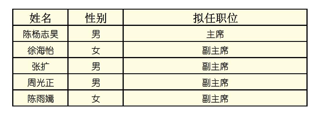 根据《嘉兴学院学生会组织改革方案》、《嘉兴学院tyc7111cc太阳成集团学生会章程》等文件精神,通过个人报名、团支部推荐、学院团委资格审查、公开竞聘等程序产生嘉兴学院tyc7111cc太阳成集团第十三届学生委员会主席团拟任人选五名。现将选举结果公示如下: