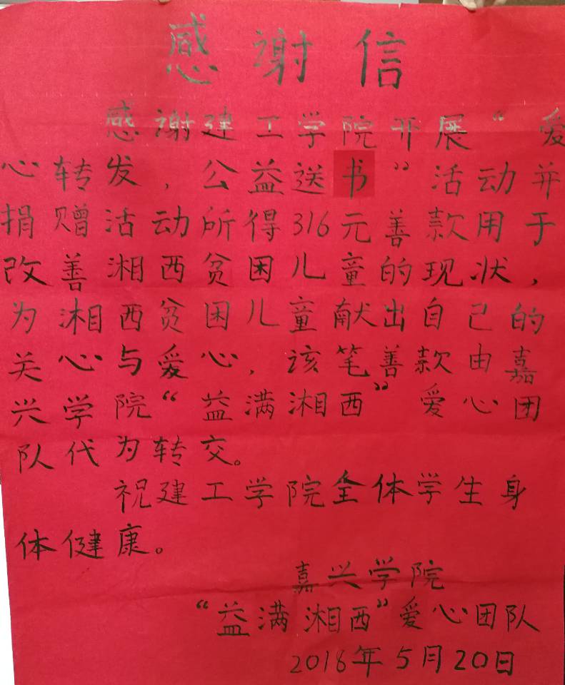 自今年3月始,我院学生会多次组织志愿者在建工学院老师的大力支持下,进行了“YOUR公益”一元爱心义卖活动,共计集得九百余元款项,全数献给益满湘西团队!