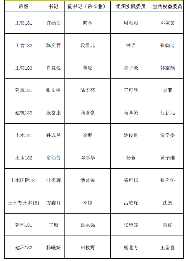 根据院团委有关班团一体化建设的要求,2018级各团支部在班主任与班主任助理的监督下召开了团组织生活会,经个人自荐、支部成员民主投票,选举产生了2018级各团支部书记、副书记(班长兼任),组织实践委员,宣传权益委员。现公示如下:
