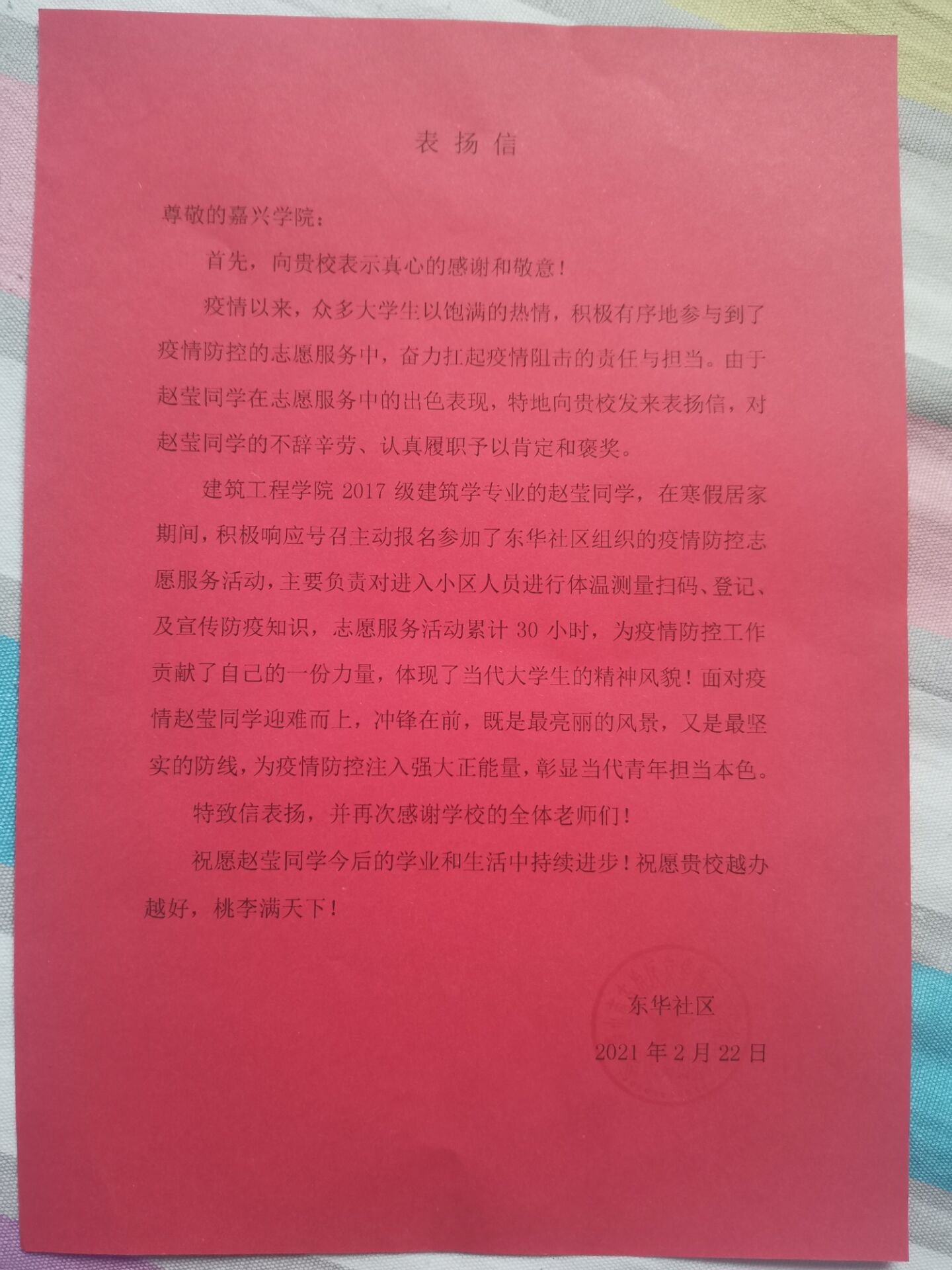 信中对我院建筑172赵莹同学、工管181许涵茜同学、建筑192张峰源及高磊同学、建环201汪济磊同学、建筑202任学渊同学积极主动加入疫情防控志愿服务队伍、为当地疫情防控工作无私奉献提出了感谢和表扬,并对我院立德树人、人才培养方面所作的努力给予了感谢。