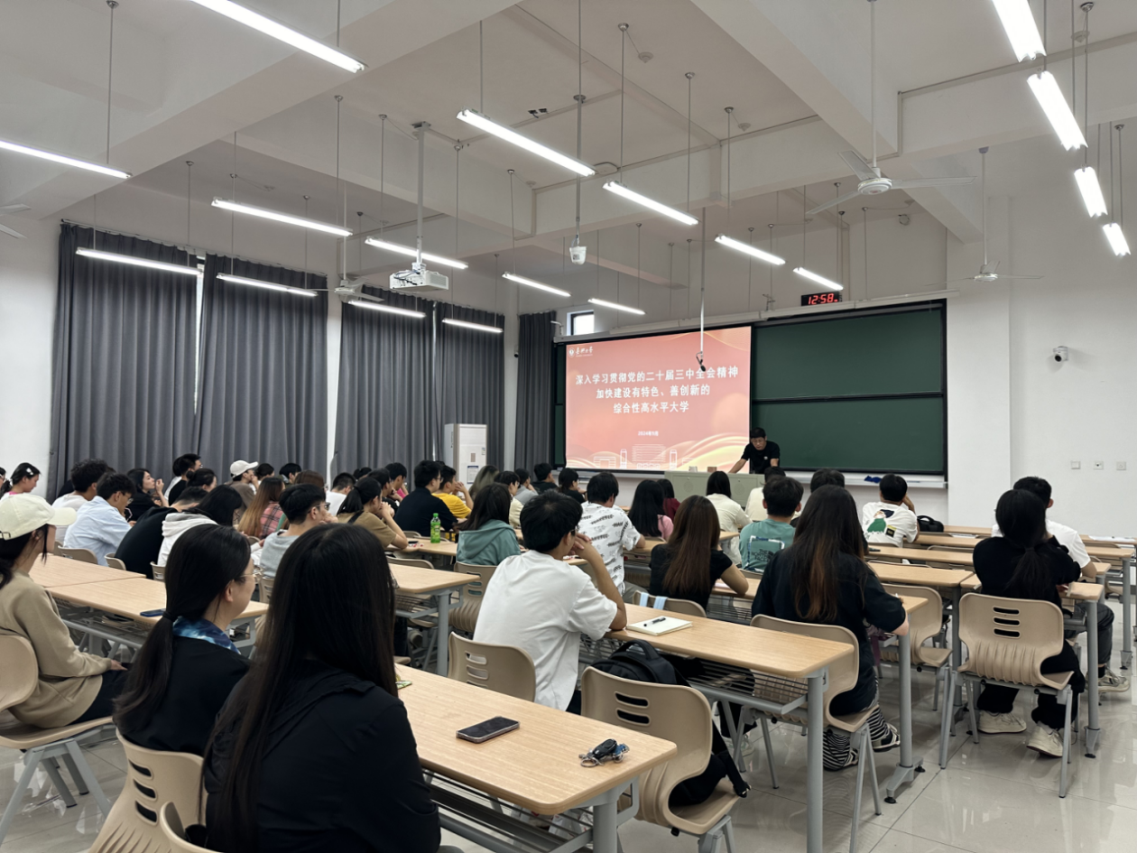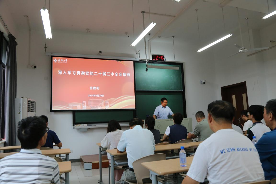 tyc7111cc太阳成集团党委特邀太阳成tyc7111cc马克思主义学院张胜利、李云波两位老师带领学院全体师生党员和党建共同体成员单位党员深度学习党的二十届三中全会精神。