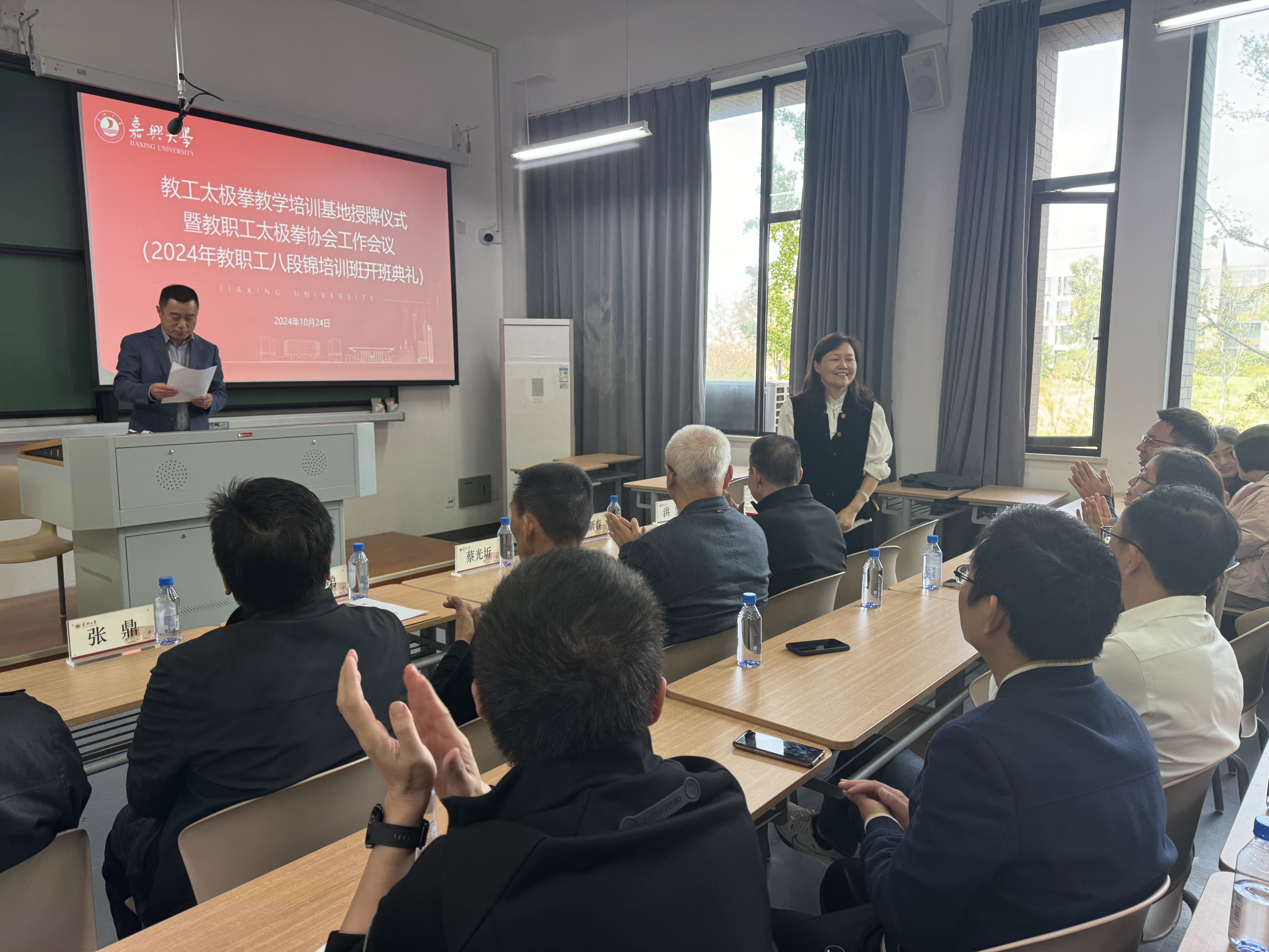 开班仪式上,嘉兴市武术协会为太阳成tyc7111cc教工太极拳教学培训基地进行了授牌,校工会还给武术协会相关教练团队成员颁发了聘书。太阳成tyc7111cc工会常务副主席洪坚表示,八段锦作为中国悠久的传统健身方式,不仅能够显著增强身体柔韧性、提升整体身体素质,还具备调节身心平衡、有效缓解工作压力的独特功效。校工会希望通过此次教职工八段锦培训班的举办,能够引领更多教职工走近并深入了解这项传统健身瑰宝,共同营造快乐工作、健康生活的氛围。