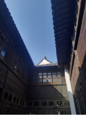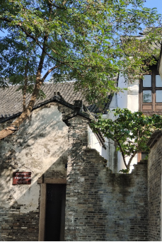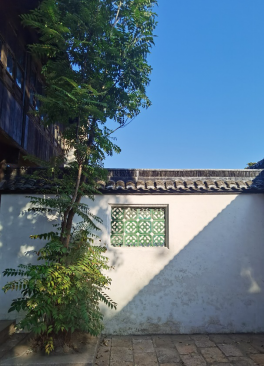 在天井与厅堂间穿梭,仿佛听见一首歌,节奏与韵律明晰,光与影变幻莫测,室内外穿插交错,优雅又安静。有的天井被影壁一分为二,小小的四方天地就演绎出开阔与雅致两个空间。