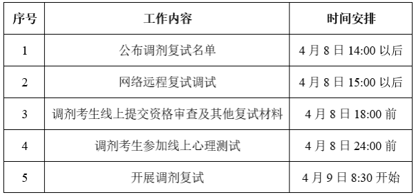 我院硕士研究生复试将采取网络远程复试方式进行,调剂复试安排初定如下,如有变更另行通知: